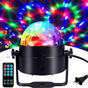 -7 colores RGB con control remoto y modo auto/flash/música: 7 colores (3 color simples y 4 combinaciones de color). Bola disco de luces de fiesta con control remoto para cambiar el color y la velocidad. Aviso: No mirar directamente la luz especialmente en modo flash.