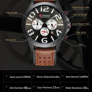 El reloj CURREN modelo 8244 es un ejemplar que refleja un balance entre funcionalidad moderna y estilo clásico. Presenta una esfera de diámetro considerable que favorece la visualización de la hora con sus indicadores y manecillas destacadas. Este modelo incluye características útiles como cronógrafo, calendario completo y resistencia al agua, haciéndolo un compañero versátil para el día a día.