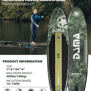 Embárcate en tu próxima aventura acuática con la Tabla de Remo Inflable DAMA SUP modelo DMYMX-08. Diseñada como un versátil SUP todo alrededor (All Around), esta tabla es ideal para remadores de todos los niveles que buscan estabilidad, durabilidad y rendimiento en una amplia variedad de condiciones de agua, incluyendo su uso para pesca. Destaca por su exclusivo diseño de camuflaje «Jungle Camouflage».