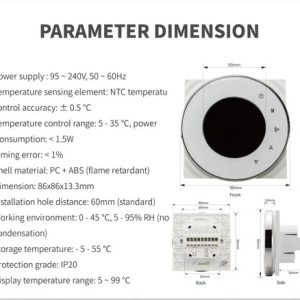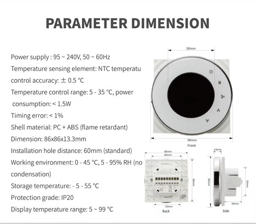 Diseño Elegante y Moderno: Fabricado con materiales duraderos PC y ABS retardantes de llama, el termostato presenta una pantalla táctil intuitiva que se integra perfectamente en cualquier ambiente.