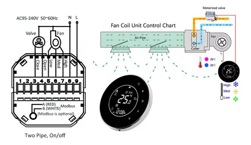 Compatibilidad Versátil: Compatible con sistemas de aire acondicionado central y unidades de fan coil (FCU) de dos y cuatro tuberías, adaptándose a una amplia variedad de instalaciones.
