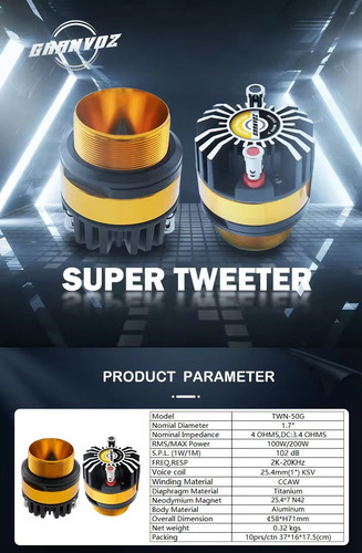 Experimenta cada detalle de las altas frecuencias con el Super Tweeter GRANVOZ TWN-50G. Este tweeter de alta fidelidad está diseñado para aquellos que aprecian la claridad y la precisión en el sonido. Con su impresionante respuesta de frecuencia de 2K-20KHz y una potencia RMS de 100W (con un máximo de 200W), el TWN-50G está preparado para entregar sonidos nítidos y limpios que completarán cualquier sistema de audio de calidad.